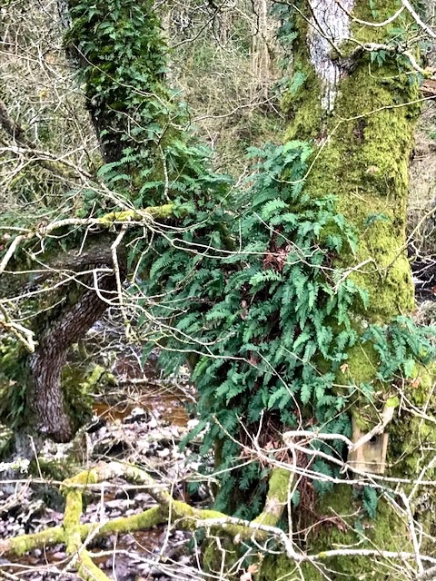 Parking at Stapleton village hall we cut across particularly boggy fields (it had rained prodigiously the day before) before descending to the river Lyne, heard before seen, in dense tree cover. Ferns thriving in the cruck of tree branches and beds of moss on bark and stone indicates the dampness levels here through most of the year.