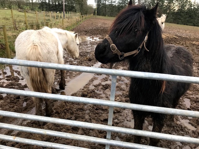 Following the lane up we climbed steadily out of the valley back into the undulating pastureland. Sheep and ponies, thinking we were carrying fodder, tracked our progress and piled in at gates as we passed in hopes of sustenance.