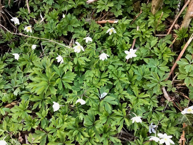 My walking companion, who knows these things, pointed out the ‘Cumberland dyke’ structure of road verge hump, drainage dyke, bank topped with hedge. This stretch was nicely maintained for good off road drainage with primroses and wood anemone emerging along the sheltered bankside. Who doesn’t love these early spring arrivals? Anemone an indicator of ancient woodland, vegatively slow spreading, delicately beautiful and the ‘prima rosa’ living up to its name.