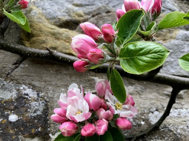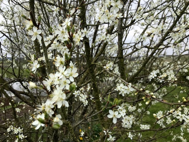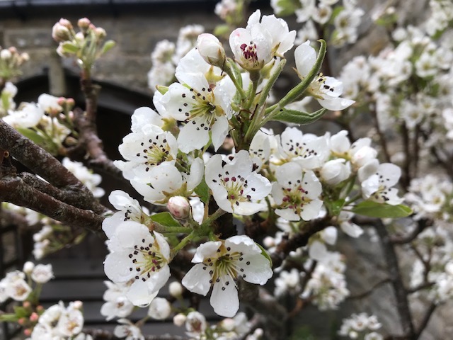 Fruit blossom time is upon us at last. First the free standing damson (above) by the kitchen garden, then the oh-so-pretty pear in a tub out front and finally the cordoned James Grieve apple on the sheltered south wall of the house.