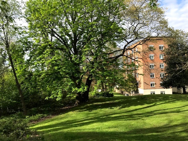We left Cox’s Walk at a junction to follow a desire path that emerged out of the wood, onto open lawns round blocks of council flats, to cross a busy road and into the quiet residential close where we were staying.