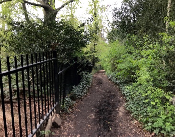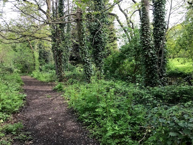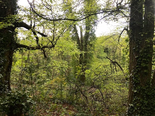 We discovered the unobtrusive entrance to Cox’s Walk, an unpaved track parallel to the old railway path, dating from the early C18th, and marvelled at the newly emerged greenness of the dappled canopy above and dense undisturbed undergrowth below. Tall metal railings painted black either side of the steep narrow path have clearly played a part in that. Designed no doubt to guard against illegal tipping and ingress from people and dogs, thus shielding the site for natural renewal.