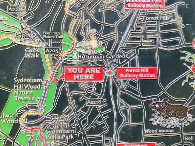 In Forest Hill we went walk about guided by my cousin, who has lived here for the last 40 years. We strolled through a patchwork of restored meadows, under old specimen trees and by high hawthorn field hedges, all combining to screen and subdue the sound of heavy traffic on the South Circular Road, AKA the A205, streaming by outside the building and grounds that dominate the hill top ridge here – the Horniman Museum and Gardens.