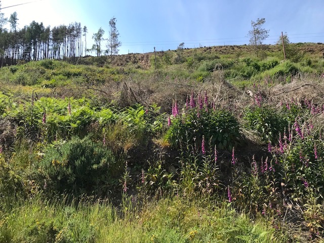 Previous clearances had enabled masses of foxgloves to flower in between fresh leaved shrubs hiding stumps of sitka spruce. Before leaving the sparkling College burn, on a corner where the access road bridged it, we came across a young deciduous wood thriving where once a block of featureless softwoods had stood. Oak, hazel and alder planted in the spirit of that original Collingwood oak wood.