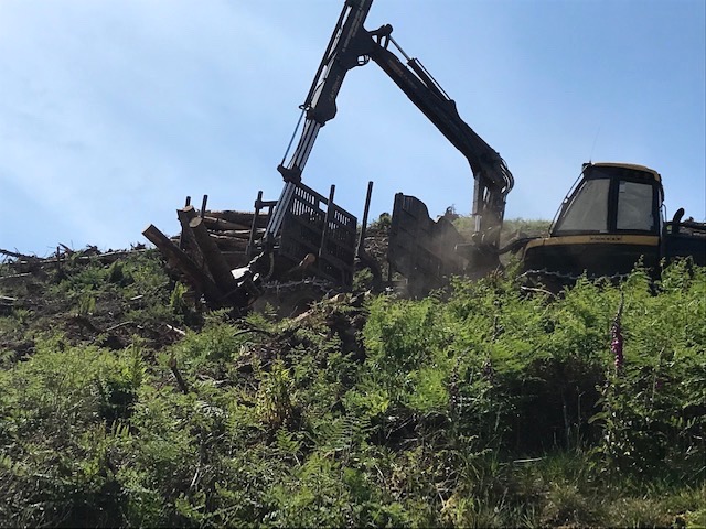 The early part of our leisurely amble up the vale took us past modern day forestry in action and we paused to admire a harvester hard at work on precipitous slopes, its driver skilfully taking out and stripping tree trunks before loading them on piles for later collection by timber trucks.