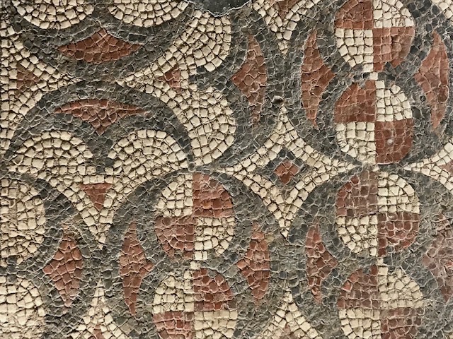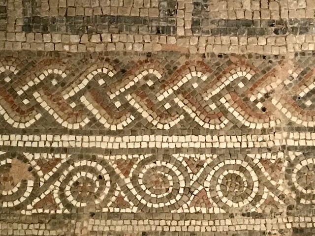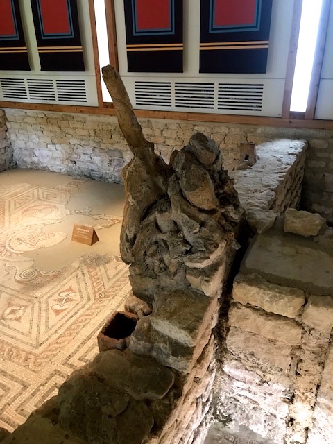 Our meander there led us along raised walkways over and around a series of fascinating floor mosaics, the largest collection in the country still in their original positions. Ploughing and other disturbances in later ages have damaged the original fabric but the remnants in the luxury dining room and baths sections remain substantial enough to impress.