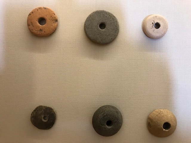 A collection of spindle whorls. Rods with weights used for twisting wool into yarn. A large part of Roman women’s work would involve clothes making for their families.