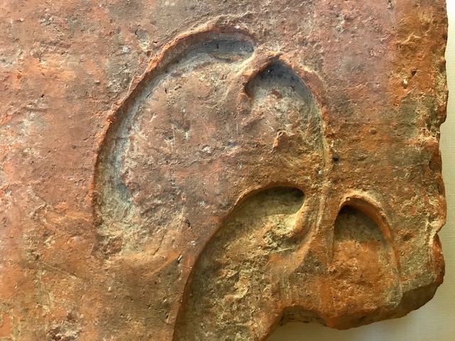 The villa’s clay tiles were most likely made in Cirencester where they were laid out on the ground to cool straight from the kiln. Two on display here present accidental indentation, one of a human hand and the other an ox’s hoof.