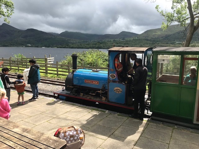 We left the museum and crossed the tracks to take a ride on the former Padarn Railway that ferried finished slate to Y Felinheli near Caernarvon for export overseas. Closed in 1961 this initial section reopened as a heritage line, rechristened as the Llanberis Lake Railway. It runs from the village along one side of the lake, at the foot of the mountain. We enjoyed an hour’s leisurely ride, in tiny cabin carriages, five miles there and back, with the odd stop to take in the views and stretch our legs.