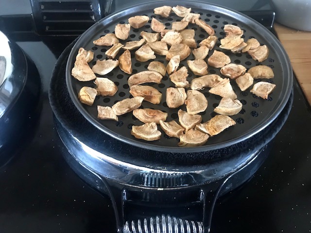The big green Arthur Turner cooking apples from the kitchen garden I peel and slice and dry for consumption through the long winter months. By trial and error have worked out a combination of hours in the lower Aga oven finishing off with drying all day on a non-stick surface over one of the lids before storing in glass jars. Always amazes me just how charged with intense flavour the dried fruit is.