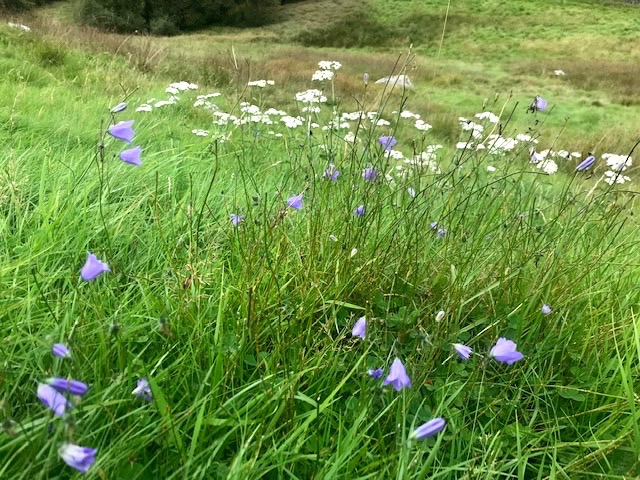 For various reasons we’ve been idle walking the bounds of the field this summer so were pleasantly surprised on a recent foray to come across a lovely swathe of yarrow, stitchwort and harebells in the higher drier parts. Southridge normally keep their posse of Texel tups on our patch by this time of year, and the delay has seen a denser growth of grass than normal, which may favour this late flowering.