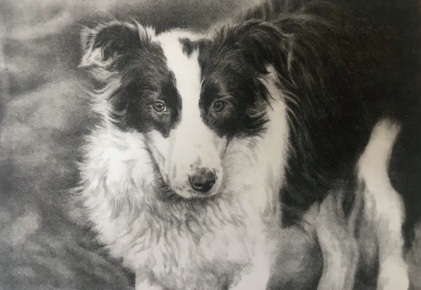 The coming of autumn, with more time spent at home after summer excursions, has given rise to a determined clear out of unwanted accumulated stuff here at the corner house. When Kim fished out this wonderfully expressive stone litho print of Meg, one of the family’s collies from farming days, I photographed it before it left us for a new home with old farming friends and neighbours. A beautiful study that bears witness to the outstanding quality of her work in one of the most time consuming and technically demanding of artistic mediums.