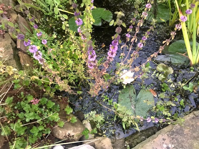 Delighted that the new pond has thrived in its first year. brass buttons & penny royal in flower, sedums at home in the gaps between surrounding stones and a succession of native alba lily flowers standing out atop the cool dark depths.