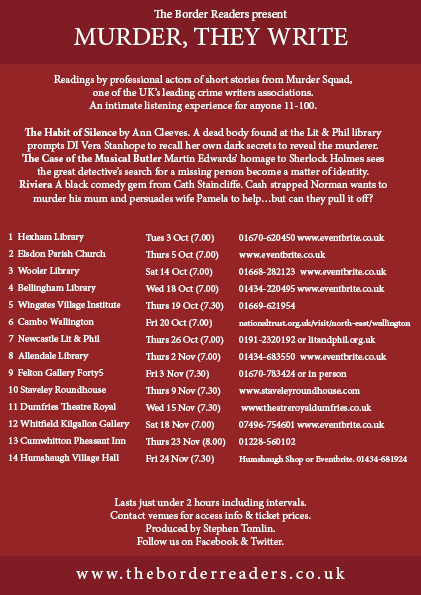 My irregular countryside diaries have taken a back seat during October and November. Most creative time has been taken up with producing and reading for Murder They Write, which has turned out to be the Border Readers most successful tour to date. Here are some of the highlights of that extended road trip…