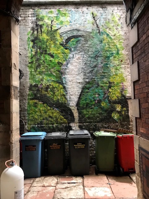 The surprise takeaway though from our day out was discovering a random series of officially sanctioned street art brightening the environment of otherwise unloved and overlooked urban scruff points. Hurray for the association of freelance artists collectively known as Blank Wall Assassins for cheering the eye with their range of pop-up graphic contributions. Particularly loved this iconic Lake District view of Aira Force filling a focal point, framed by a covered ginnel populated with pigeon nests and commercial wheelie bins. Brilliantly effective work by artist Martin Evans (2020)