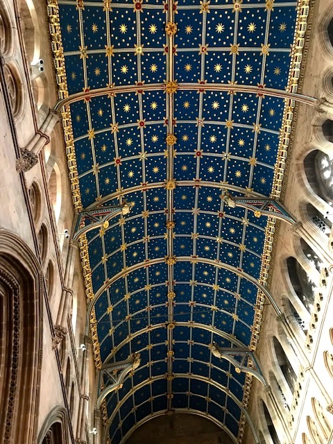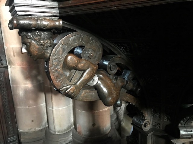 Amongst those Cathedral’s treasures are the Tudor Salkeld panelled wooden doorway with its profiled faces of worthies, the magnificent star spangled barrel roof put in during the mid Victorian restoration and an imposing Jacobean wooden pulpit with its curious carved supports, as well as the magnificent medieval choir stalls and their reverse side C 15th full length paintings of the saints. Interesting to note that figures at ground level have been defaced by protestant iconoclasts at some point post-Reformation whilst those tiered above and out of immediate reach have not, thus retaining their facial features.