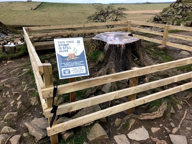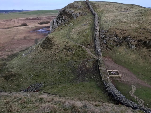 We perched in the lee of Hadrian’s wall overlooking the fenced stump of the iconic tree, reflecting on its meaning and great loss. That was followed by conversational recall of some of our favourite poems and blank verse before breaking off to enjoy a simple picnic. At this point we caught the sound of ethereal instrumental music from an unseen source. Suddenly, from the other side of the wide wall, three lanky teenage boys emerged carrying a ghetto blaster. Oblivious of our presence, we became their de facto audience, witnessing an improvised lament for the tree’s cruel demise. Ritual complete they got off their knees, laughed awkwardly and moved at pace up the steep side of the gap to disappear over the brow. We were left alone again, suitably bemused, yet happy to be upstaged by their singular homage.