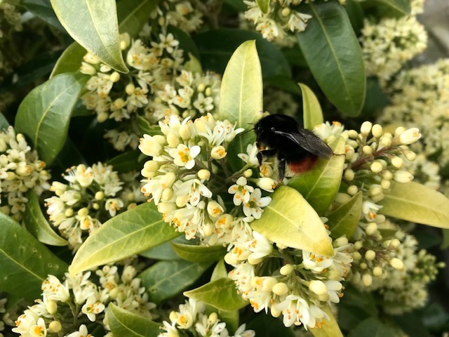 If I were a flying insect in our garden though – like this red tailed bumblebee – my blossom favourite would have to be the Skimmia under the kitchen window. This bush’s powerfully enticing aroma gets a host of bees and flies of all types topped up on nectar.