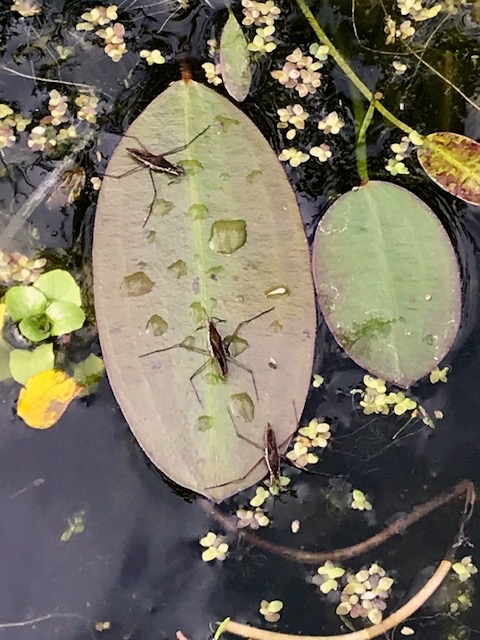 I take stock of activity down on the ponds most days. Delighted to see the water skaters are back. They like to park up on the oval leaves of the water hawthorn, like taxicabs in the rank, waiting to skate away at a moment’s notice across the viscous surface in search of sustenance. Of three pairs of legs each insect has, the middle ones are for rowing while rear and front pairs do the steering. Thick pads of hair repel water, preventing it from sinking while the tips of the steering legs detect tiny vibrations emitted by its even smaller insect prey.