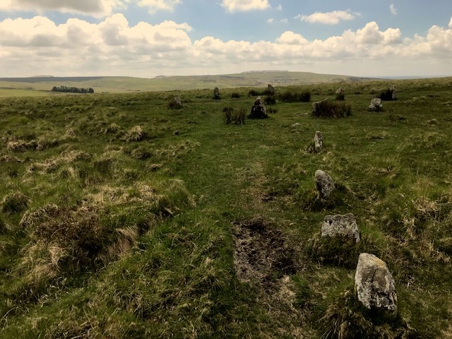 We were curious to see what antiquities could be discovered on this short circular walk. The area of the Upper Plym valley – some 6 square miles – boasts over 300 Bronze Age, medieval and later sites. Our first stop was one of these special places, Brisworthy stone circle. I think it may be a surprise to many, me included, that so many of Dartmoor’s 90 recorded stone circles have been extensively restored. Brisworthy is no exception. Back in 1909 pioneering archeologists put 17 of the original fallen granite blocks back in their holes, to join those still standing. There’s a gap where a couple are missing and these are now thought to form part of the neighbouring field wall.