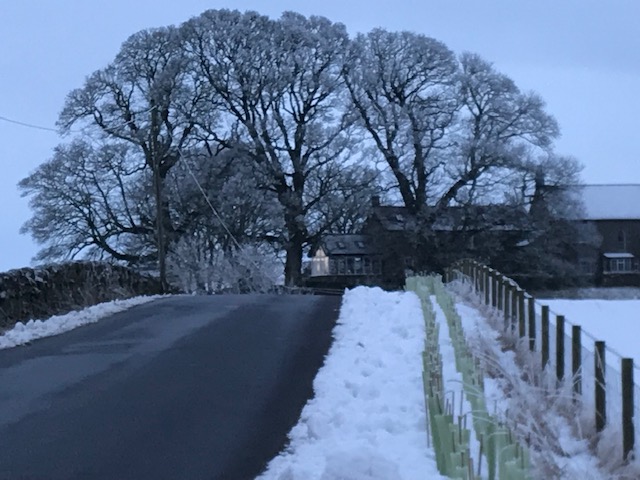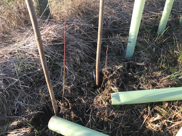 I was delighted by our neighbour’s efforts in bordering roadside boundaries with the planting of hedges last autumn (See previous diary). Recent bouts of snow followed by a severe storm took a toll of the stripling plants in their plastic covers, staked with bamboo. Reuniting all three elements when taking daily constitutionals has been a satisfying thing to do. Stretching or leaping across roadside drainage ditches in places adding an extra fitness testing edge to the exercise.