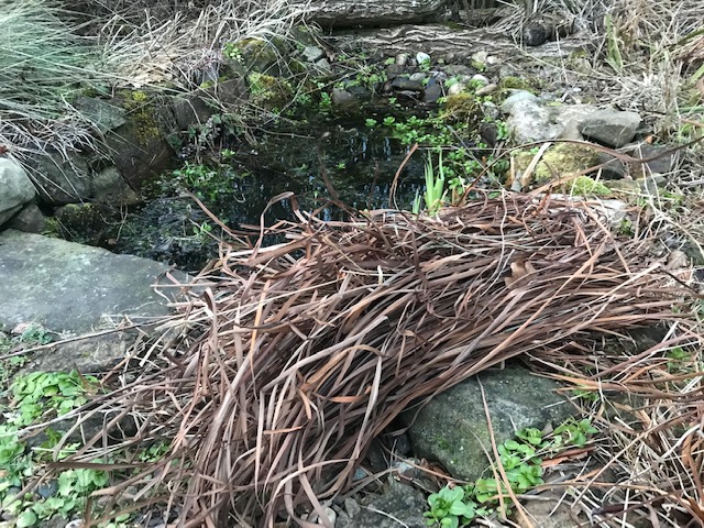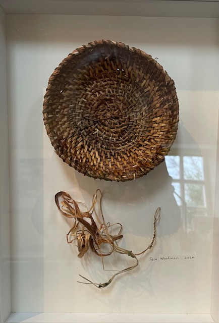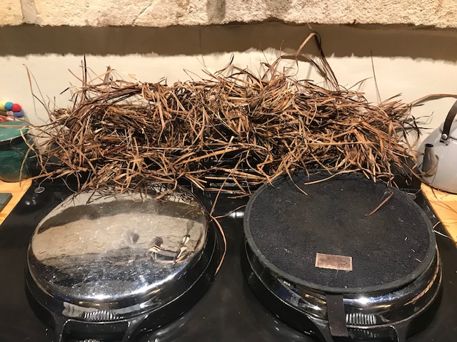 Clearing last year’s dead foliage round the garden ponds has spurred a bonus product. The brown leaves of Iris sibirica make for good material in soft textile basketry weaving so I cut and dried this bundle by the kitchen Aga to pass on to Sara, the family’s natural fabric worker of fine pieces.