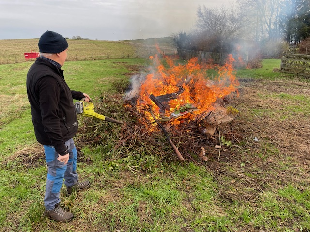 Gardening tasks undertaken when weather permits include clearing banks of dead foliage, starting to prune, nourishing compost heaps, fishing surplus leaves from the ponds. With the help of a neighbouring friend, who brought his leaf blower to push the necessary oxygen, we had fun setting a bonfire in the field with cautious use of petrol to ignite the damp mass.