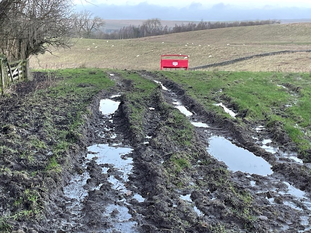 Neighbouring farms’ cattle and sheep are rotated around sodden pastures. My eye caught by the substantial red metal creep feeder which allow the shorthorn herd’s calves dedicated access through metal bars to get their fill of hay. A foretaste of Spring and the lambs to come. Flocks of ewes graze, rumps raddle marked by tups in harness. A Suffolk lords it in one neighbour’s field, A Texel in another and an old favourite from past years, Southridge’s Border Leicester in the field opposite us. BLT I call him. He’s always fearless and inquisitive when we meet so suspect he’s been used to handling from an early age. Curiously, there’s no harness on him, but has obviously been hard at work.