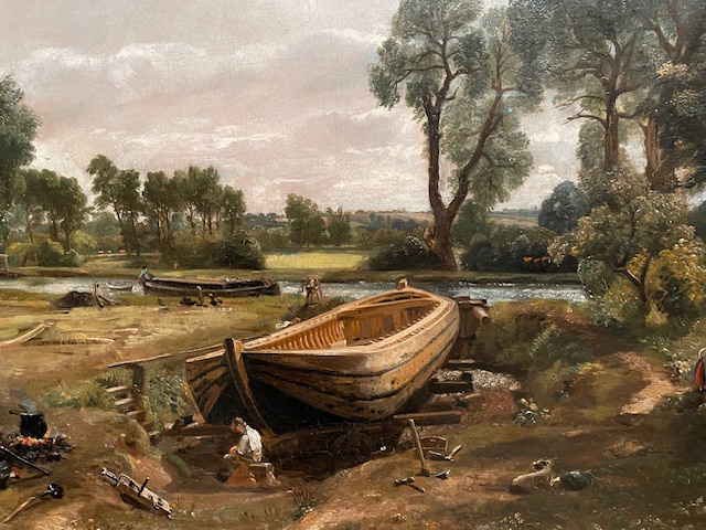 By way of contrast Constable reveres the age old crafts – boat building in a dry dock off the River Stour. Barges like this floated his father’s stores of grain to Flatford mill and beyond. They were the foundations of the family’s fortunes and are lovingly captured in this oil painting of 1815. Constable must have revisited his childhood self in such scenes. A warm memory, in his own words, of a ‘careless boyhood…which made me a painter.’