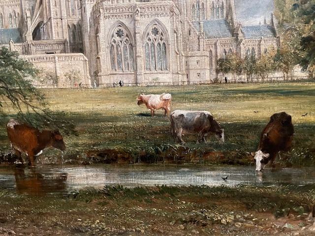 My eye was more drawn down earthwards, to the creatures in the foreground. Like the work of the C17th Dutch master Aelbert Cuyp, Constable clearly had a soft spot for cows, and they seem to represent the kind of rural contentment and prosperity he so valued. The beast on the left, having just drunk from the river, drools water while on the right a house martin hovers to catch flies over the stream.