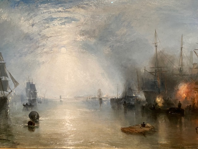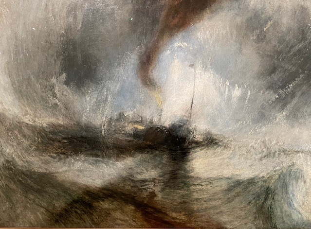 In Turner’s thrilling immersion we’re pitched into the dynamics of mechanised invention engaged with great elemental forces . ‘Snow storm – Steamboat off a Harbour’s Mouth’ (1842) is an outstanding example of the artist’s innovative style. Turner claimed he was lashed to a mast so he could safely observe the scene. I mused to think how much more disorientating this kind of artistic vision would have been when first viewed by the public.