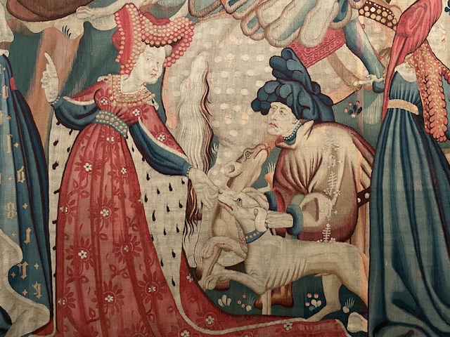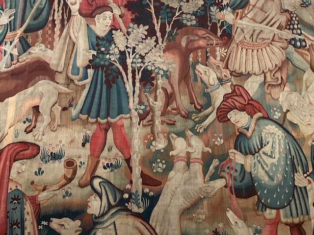 Conspicuous wealth is on show here, the tapestry’s narrative function as great as that of its role decorating and insulating a castle or household interior. Only Kings and aristocrats were allowed to hunt game, like the bears and boars depicted here, and participants attire is strictly status related, eschewing practical hunting clobber. The ladies fur for example is miniver, an expensive pelt from the bellies of hundreds of Baltic squirrels culled in winter.