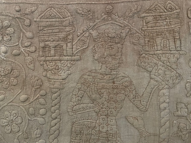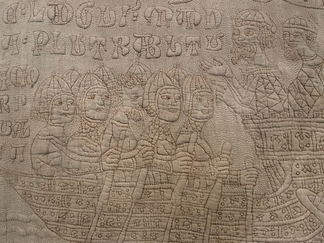 It’s a wonderful display of compressed narrative detail chronicling the epic story, with extra pieces attached at various times, fashioned from linen and cotton. Kim, who comes from a long line of quilters, was particularly impressed with the skill involved in its execution.