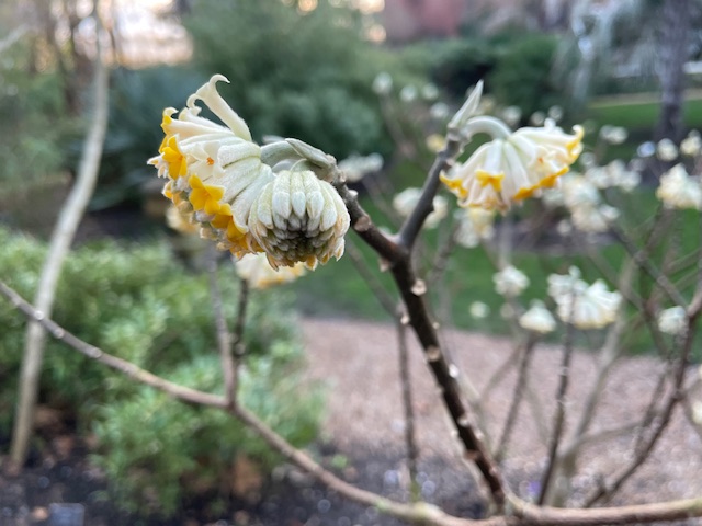 Arrested by an entrancing aroma, my nose led me to a plant with yellow tufts of flowers called Edgeworthia Chrysantha, AKA the Paperbush shrub, which originated in China. The long inner bark of the plant, known in Japan as Mitsumata, was used for centuries to make bank notes there, so strong and tear proof is the natural fibre when pulped. A fascinating origin story, just one of many plant histories recounted here.