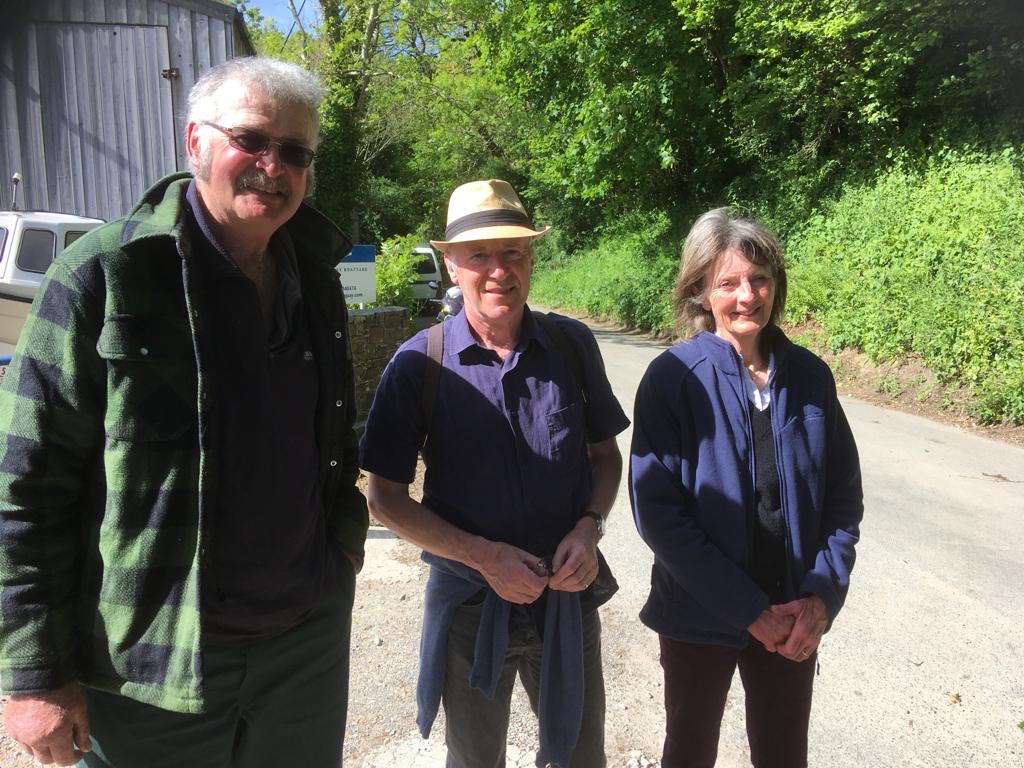 At Lower Nutley, Janet heard an almighty bang whilst in the sheep shed, and looked out to find the roof of an old shed in the lower field completely gone and deposited in the field above the cottage. The shed, which we have always referred to as ‘The Abbot’s Linnie’, had been useful as a nursery for ewes with young lambs, but alas no more. Scrolling on to May, Steve Allen – an old Tavistock School friend – and his wife Kim were spending a short break in the vicinity and dropped in to see us. He is an actor by trade (AKA Stephen Tomlin), with an interest in all things local and historical and so we took them over the lane to see the old building in its damaged state.