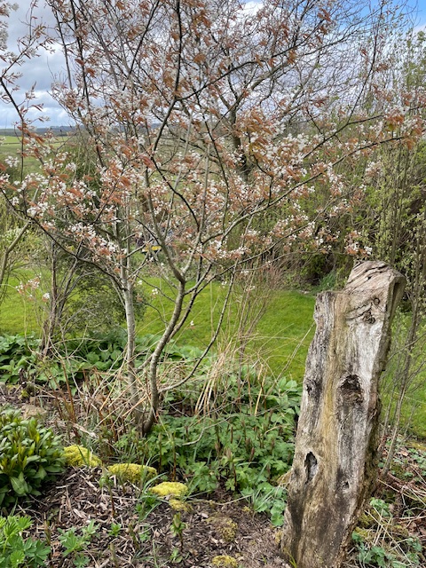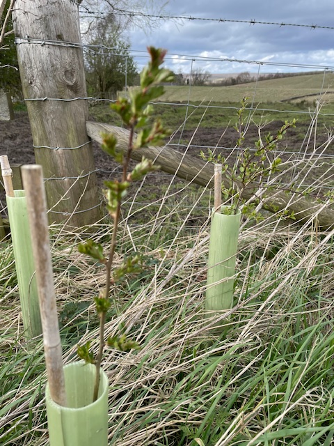 Good progress on the mile of roadside hedging either side of our abode established by our friends and neighbours at Southridge. I continue the volunteer monitoring, rectifying fallen guards, replacing rotten or broken canes. Now hawthorn and hazel, blackthorn and run ahead roses are breaking cover, waving in the wind atop their protective plastic tubes.