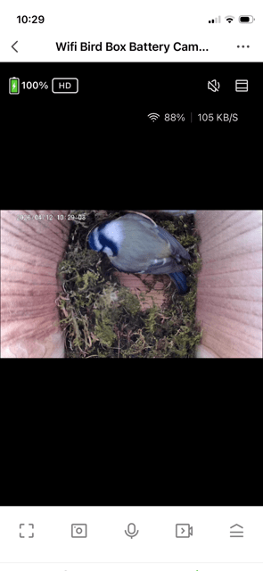 Within hours the camera showed us a shake of moss on the box floor. I took that to be a down payment by a would be tenant and gradually more material appeared. At first I thought a wren might be the mystery depositor but soon we caught sight of the visitor. Rather unsurprisingly it turned out to be one of the blue tits that colonise the garden every year.