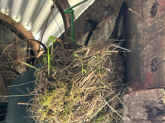 Meanwhile in the open gated garden shed we call the railway hut – the body of a former goods wagon – blackbirds have again taken up residence. In previous years they favoured a seed tray on a high shelf to support their intricate weaved abode. This year, oblivious of our entrances and exits inches from them, their nest sits exposed atop coat hook nails flush by the doorway. The hen, all head and tail, totally silent and still, keeps a sharp eye on our comings and goings.