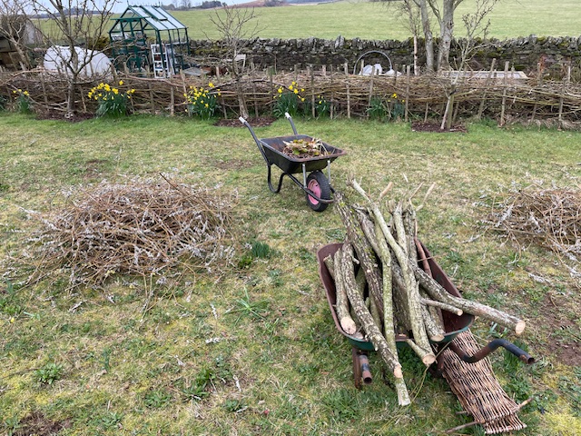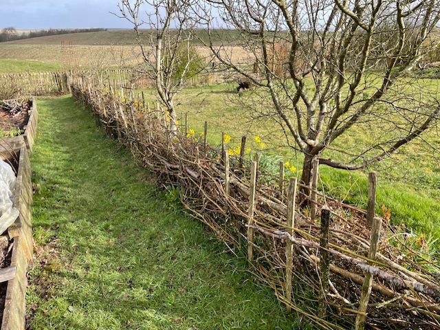 Earlier this year I decided to create a dead hedge in the garden. By recycling as vertical stakes the best preserved chestnut paling in the picket fence that separated kitchen garden from meadow we were able to establish the hedge’s breadth and length. Then built up horizontal layering and weave with pruned branches of old willow, alder and various woody bushes over following weeks. A remarkably satisfying transition, relatively easy to accomplish, in the rustic tradition!