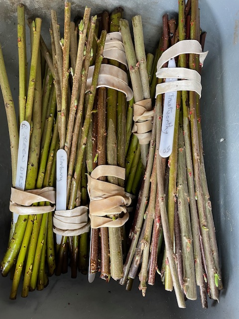 I never knew there were so many varieties of willow. In the wake of my clearing old established ones from the largest copse the serious family gardeners/ craftswomen planted these varieties in wet ground and large pots with an eye to harvesting for weaving into baskets and wreathes. I will chip what they don’t use for mulching and adding to compost. The straight young wands go down the throat of my noisy little chipper a treat and cause it few digestion problems, unlike tough knotty stuff like hawthorn or blackthorn.