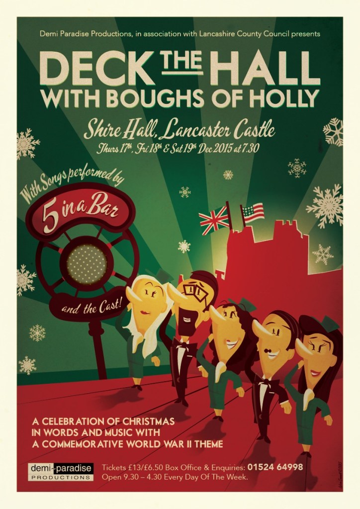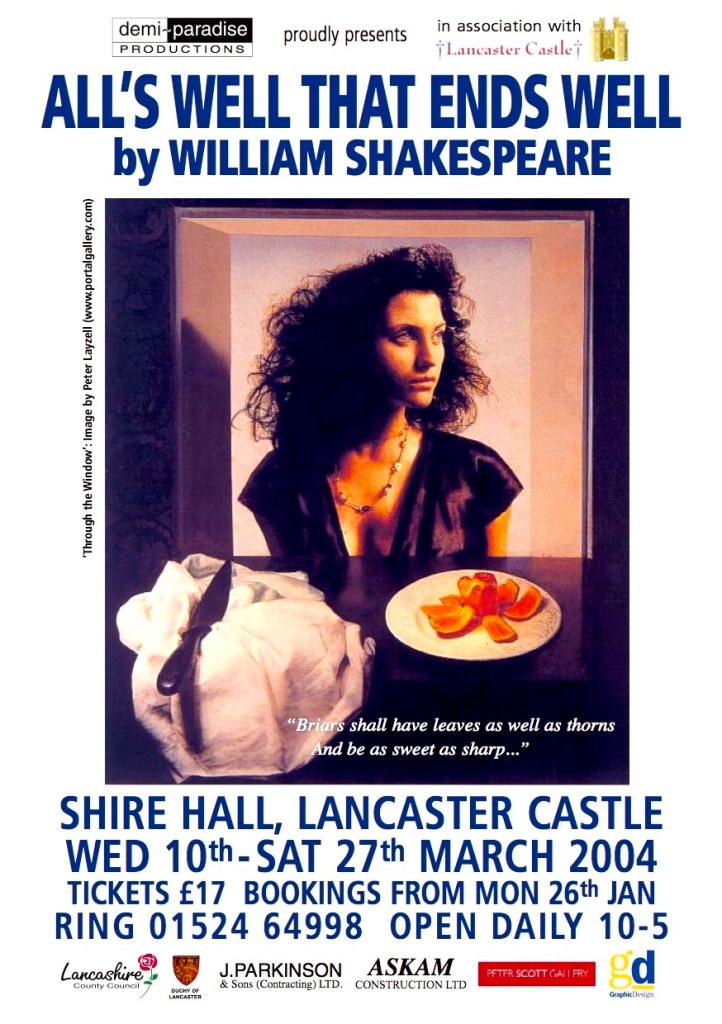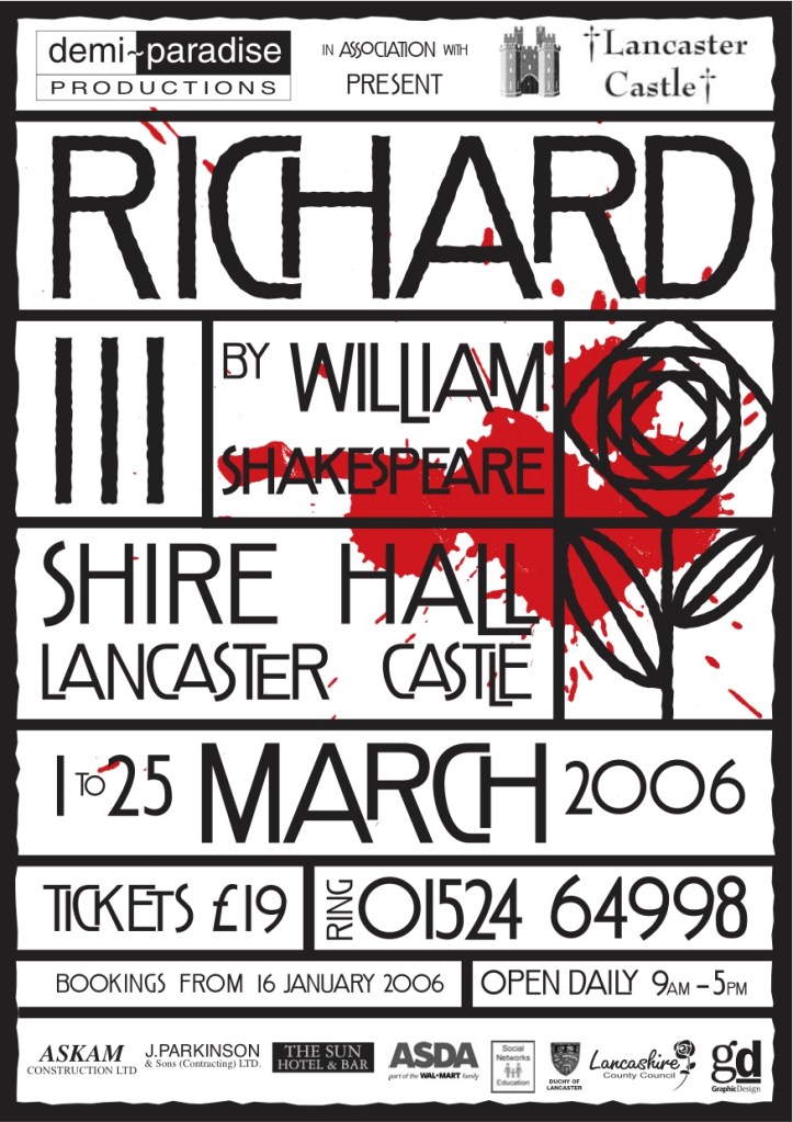 Demi-paradise was distinctive in commissioning artists-in-residence to interpret and record three of its Shakespeare productions (Much Ado, Othello & Measure for Measure). The six professional artists involved exhibited their subsequent work at galleries through NW England. There’s not enough space to showcase all their work but here’s a sample from each…These are followed by examples of posters and tickets commissioned by Stephen from graphic designers Andi Chapple (Merchant of Venice) and Ian Steele (Richard III); portrait painter Peter Layzell (All’s Well…), and virtual reality designer Adam Emmot (WW2 Deck the Hall…special)