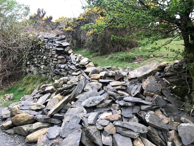 We circumvent the tarn, only bordering its shores a little way, wending through open woods with some ancient oaks, past a slew of slates where a wall has been recently broached, before heading uphill on a well worn stony track. Not clear whether the winter’s storms had brought a tree down to smash the wall but, as elsewhere around the country, the land is littered with tree trunks and here, if not blocking paths or roads, are left to lie and decay for nature’s sake.