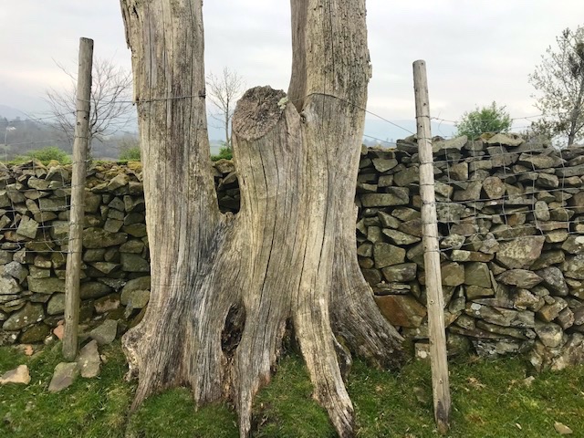 A traditional slate barn, dark and dominant, tops the hill we climb. By the hedge in a field we pass a new born lamb takes its first hesitant steps whilst the mother, trailing after birth, carries on grazing. We pass the curious ghostly remnant of a tree, fissured and blanched bark splayed like an animal hide.