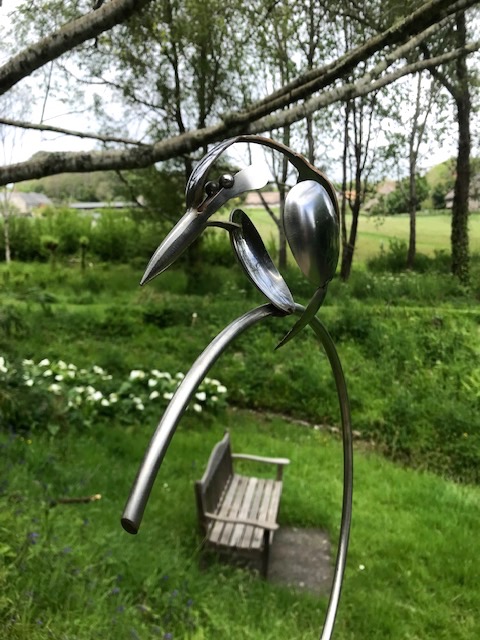Returning through the woods, we could see through to where the next generation of the family were leaving their mark on the land – a series of shallow ponds feeding off the combe’s stream had been excavated. In a few years they will no doubt look as embedded as the rest of the extended garden landscapes. Came across the original ornamental pond and bog garden, a feature half hidden by exotic blooming evergreens and giant gunnera. We also encountered small pieces of contemporary metal sculptures of birds and animals skilfully fashioned from cutlery, like this kingfisher.
