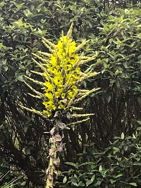 Our attention was drawn to an example of puya chilensis, a member of the pineapple family, flowering now for the first time in twenty years. In its native South America small birds and mammals seeking nectar act as pollinators, and sometimes they end up feeding it too. The leaves have vicious inward facing barbs so any unfortunate creature getting caught by them only adds to its diet.