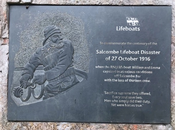 Leaving Overbeck’s we climbed steeply by path and steps to gain the high open spaces skirting Bolt Head. And what an impressive stretch of coastline it is. A simple plaque on a viewpoint overlooking the estuary reminded us of how fiercely powerful the elements can be and the immense bravery of those who risk their lives to save others from natural disaster.