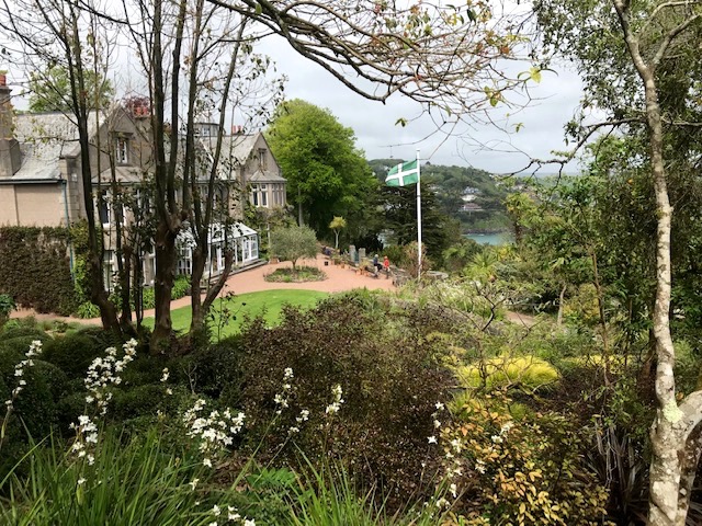 Each garden room opens to another as you rise up or step down to enter them. The contrast of tall semi-tropical trees and native foliage is striking. The green, white and black County flag reminding us of the Devon Riviera location.Trees planted more over a century ago in the woodland area, laced through with winding paths and hidden viewpoints, have added more privacy as they’ve grown to maturity, as well as providing extra shelter.