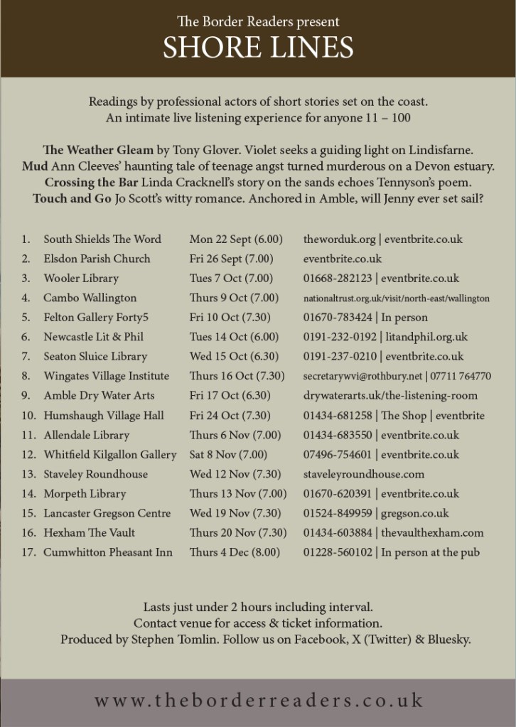Shore Lines toured between 22 September – 4 December 2025. We delivered a diverse, always entertaining, line up of short stories from our brilliant writer friends Ann Cleeves, Linda Cracknell, Tony Glover and Jo Scott. Ann’s haunting crime story Mud was set in her home county of Devon, while Linda’s poignant narrative Crossing the Bar, inspired by Tennyson’s classic poem, reflected her own family’s maritime history and was originally broadcast on BBC Radio 4. We were particularly proud to have commissioned the other two stories, set on the Northumberland coast. Tony Glover pennedThe Weather Gleam, narrated by Charlie, the heroine’s spirited Bedlington terrier. Jo Scott returned with another heartwarming witty tale inTouch and Go, a tale that drew on her own background as an experienced yachtswoman.