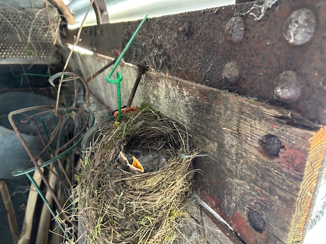 Meanwhile in the open gated garden shed we call the railway hut – the body of a former goods wagon – blackbirds have again taken up residence. In previous years they favoured a seed tray on a high shelf to support their intricate weaved abode. This year, oblivious of our entrances and exits inches from them, their nest sits exposed atop coat hook nails flush by the doorway. The hen, all head and tail, totally silent and still, keeps a sharp eye on our comings and goings.