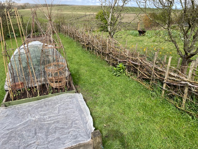 Earlier this year I decided to create a dead hedge in the garden. By recycling as vertical stakes the best preserved chestnut paling in the picket fence that separated kitchen garden from meadow we were able to establish the hedge’s breadth and length. Then built up horizontal layering and weave with pruned branches of old willow, alder and various woody bushes over following weeks. A remarkably satisfying transition, relatively easy to accomplish, in the rustic tradition!